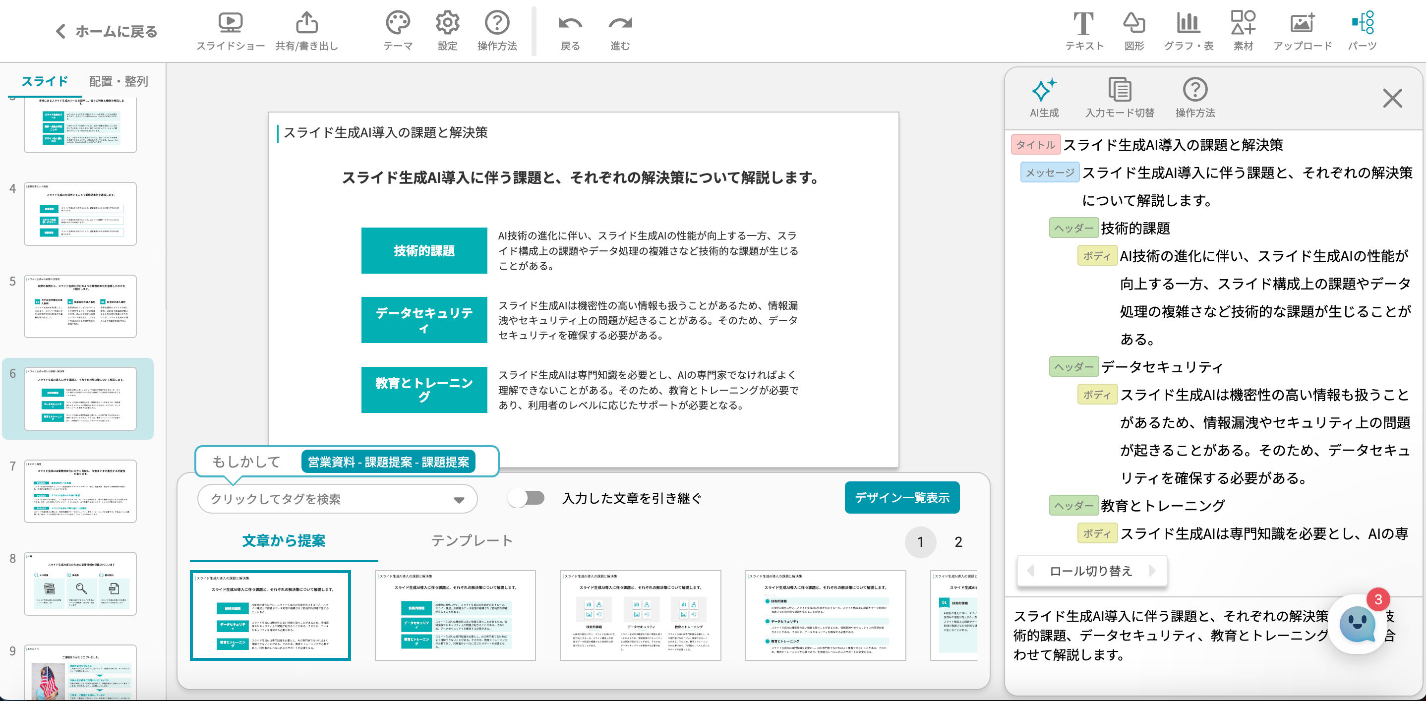 ビジネスの現場では、スライド作成に多くの時間が費やされ、効率性が低下しています。また、クオリティの高いスライド作成には専門知識や経験が求められるため、チーム内での課題となっています。