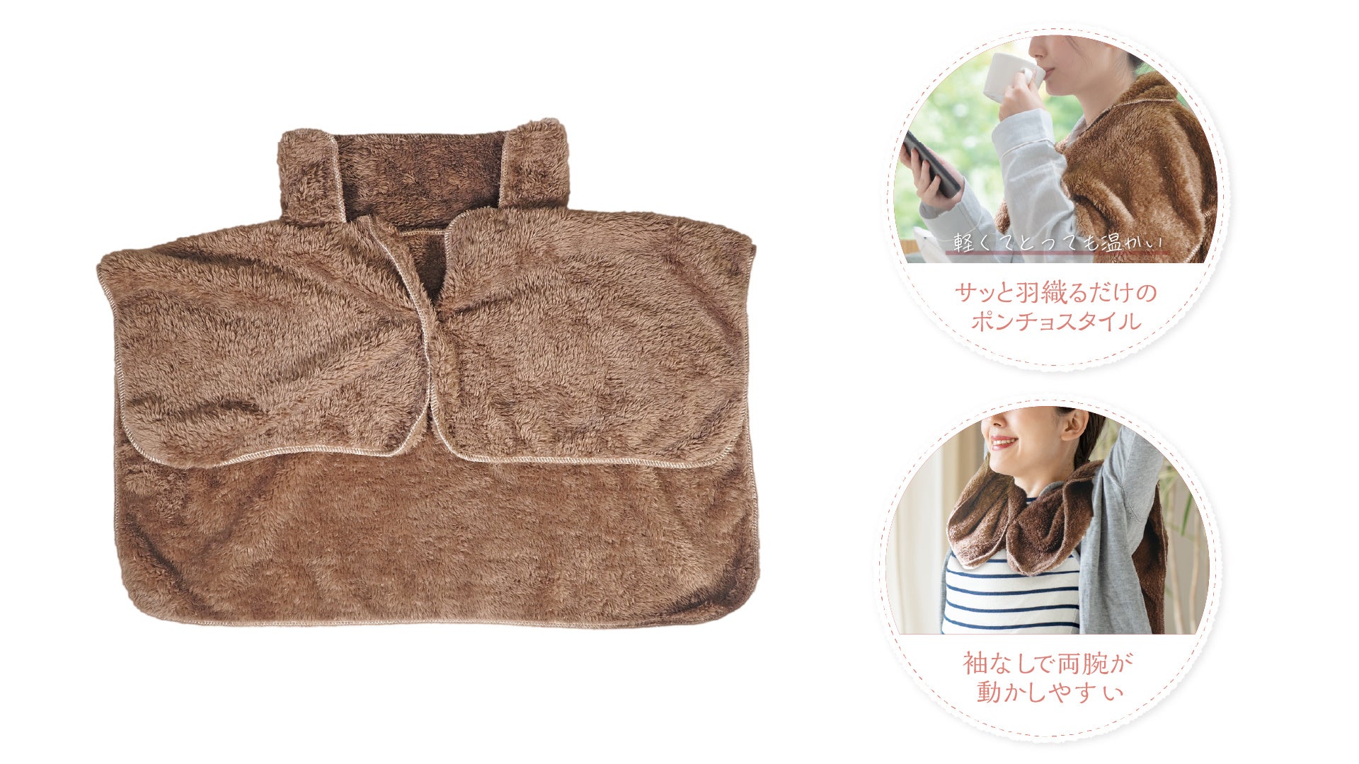 特徴:USB給電式のポケット付き電気ブランケット。3段階の温度調節機能付きで温かさを調整できます。ポケットが付いているので冷えがちな手もぬくぬくに。腰に巻いたり、肩からかけてポンチョにも。