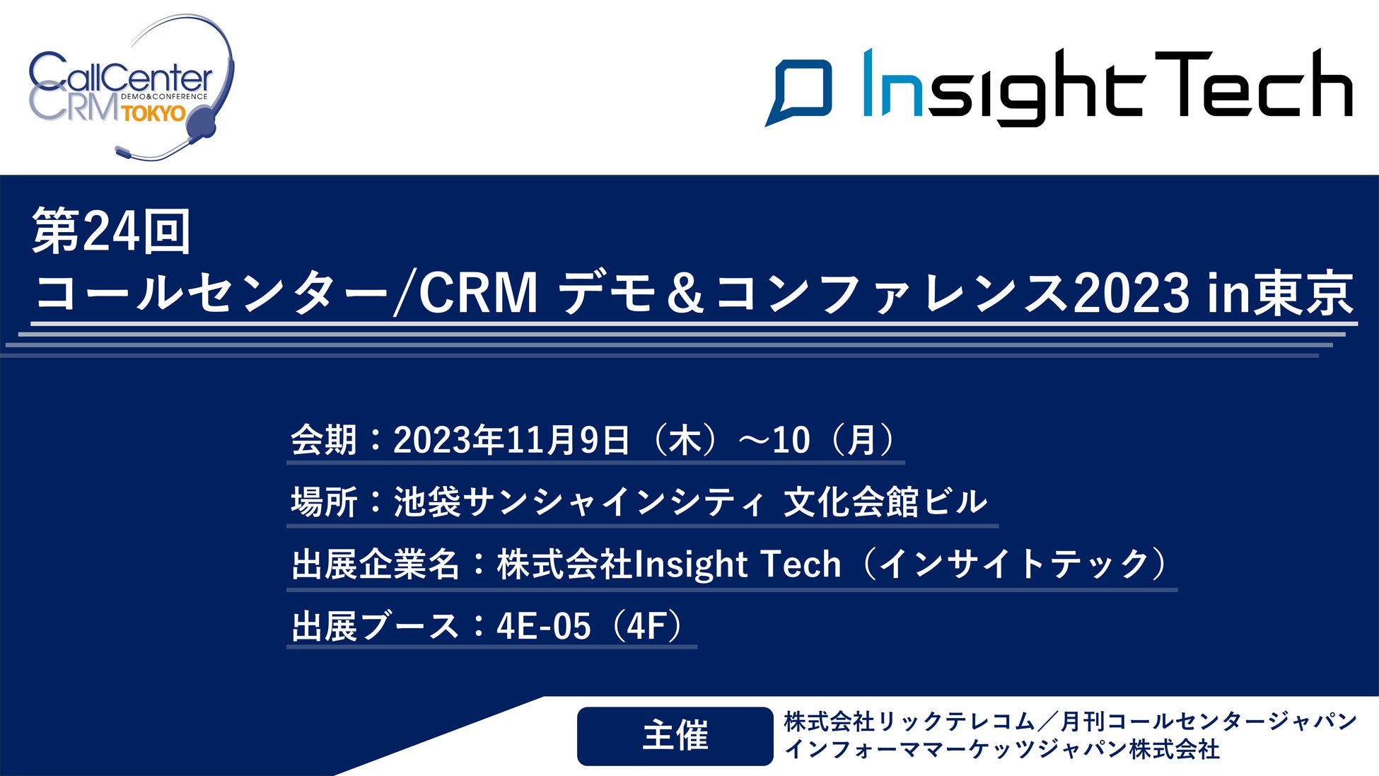 Insight Techは、コンタクトセンター/カスタマーサポート業界に特化した国内唯一・最大のビジネスイベントである「コールセンター/CRM デモ&コンファレンス 2023 in 東京」にブース出展いたします。