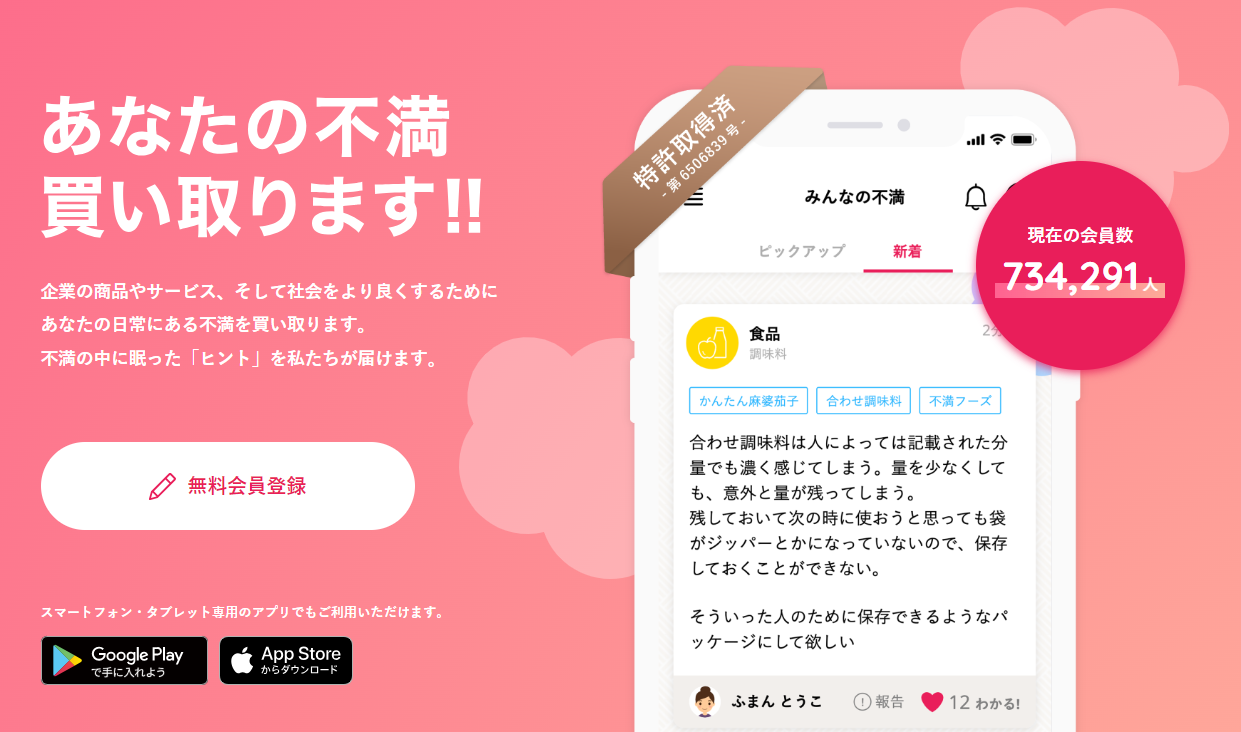 不満買取センター(特許取得済み)は、「企業の商品やサービス、そして社会をより良くするために、あなたの不満を買い取ります。あなたの不満の中に眠った”ヒント”を私たちが企業や社会に届けます」をコンセプトに、2015年3月18日からサービス開始をしております。Webサービス及びスマートフォンアプリを通して生活者からの不満の声を収集しており、現在累計73万人以上の会員から、累計4,000万件以上の不満を買い取っています。