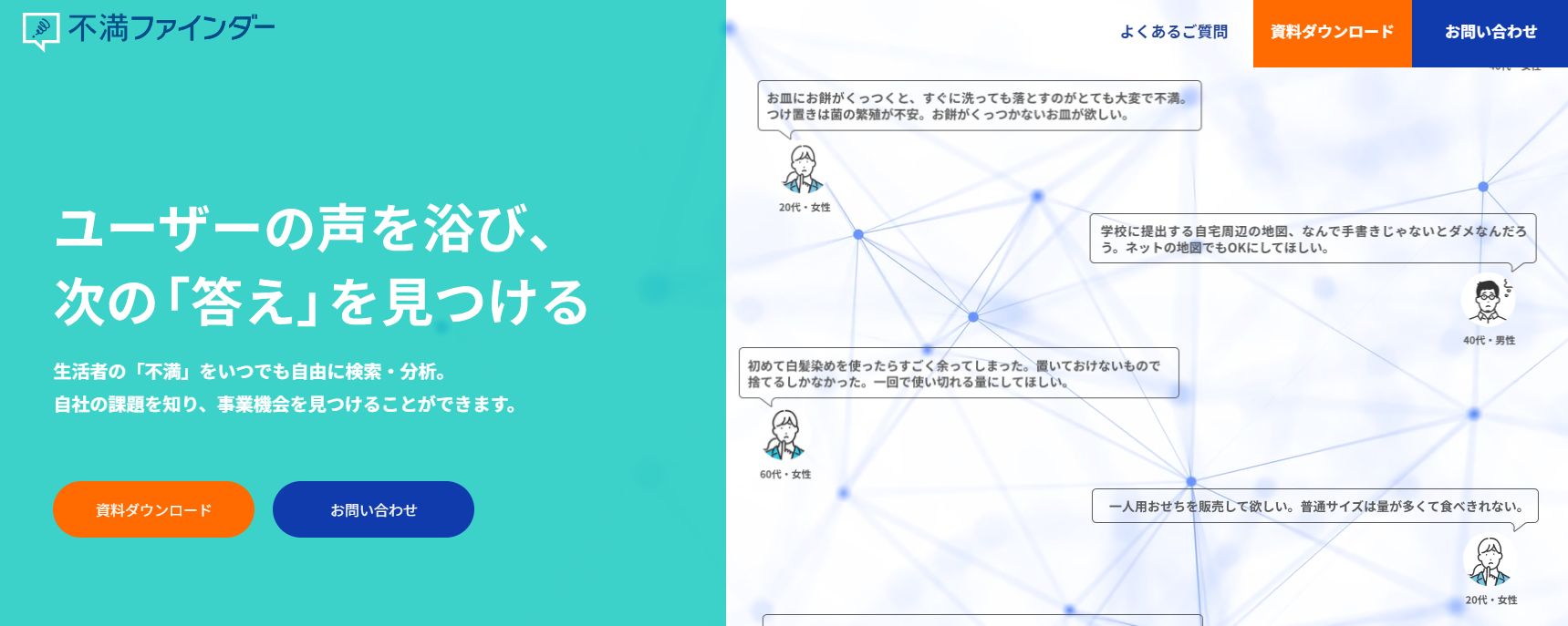『不満ファインダー』は不満買取センターに寄せられた不満ビッグデータから、都度、テーマや課題にあったデータを検索・抽出でき、これを対象とした多角的な解析を高速で実現する全く新しいデータ×AI活用型SaaSです。