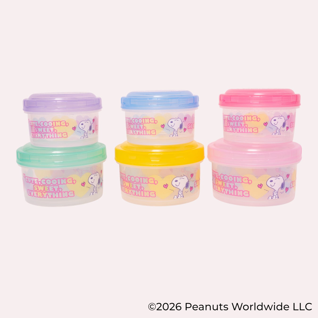 「スヌーピー」とカラフルなハートがデザインされた、透明感が美しいランチグッズ。コンビセット、アクリルコップ、フードコンテナーで、毎日のランチタイムをより快適で便利な時間へと導きます。