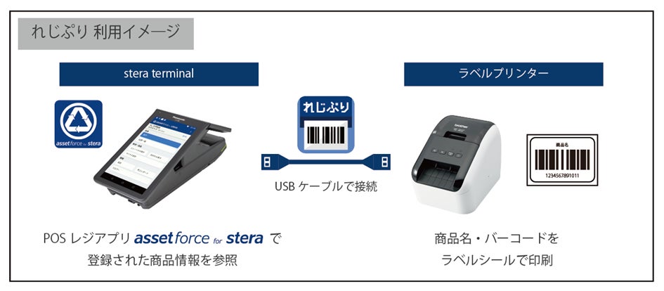 「れじぷり」は、stera terminalとラベルプリンターをUSBケーブルで接続するだけで利用可能です。stera marketより「れじぷり」をインストールし、「assetforce for stera」のユーザーID・パスワードでログインし、POSレジアプリに登録された商品情報をベースに、ラベルプリンターでバーコードラベルを印刷することができます。