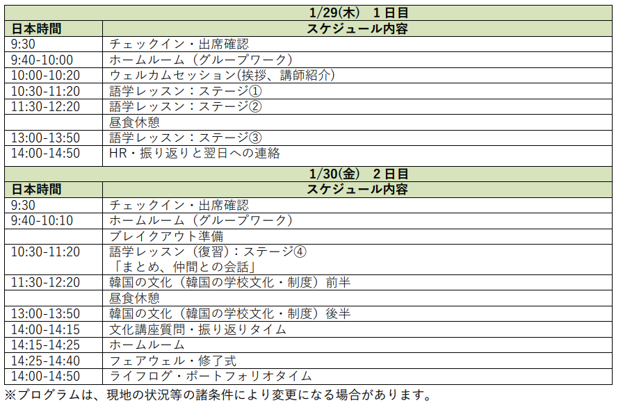 本プログラムは、韓国人講師や全国の第一学院高等学校の生徒との交流を通じて、実践的なコミュニケーション力を育むことを目的としています。