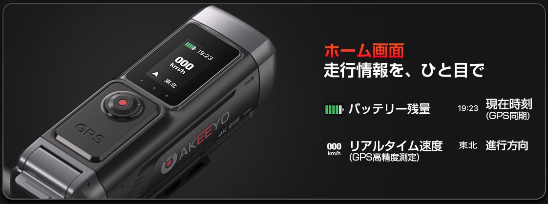 スワイプ操作対応のディスプレイをカメラ本体に搭載。Wi-Fi・GPS・解像度などの設定をスマートフォンアプリを開かずにその場で変更できます。GPS連動によるリアルタイム速度・進行方向表示にも対応しています。