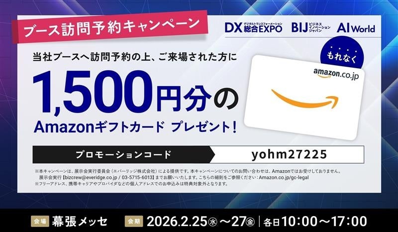 また、ブース訪問予約をいただいた方には、1,500円分のAmazonギフトカードを進呈いたします。
