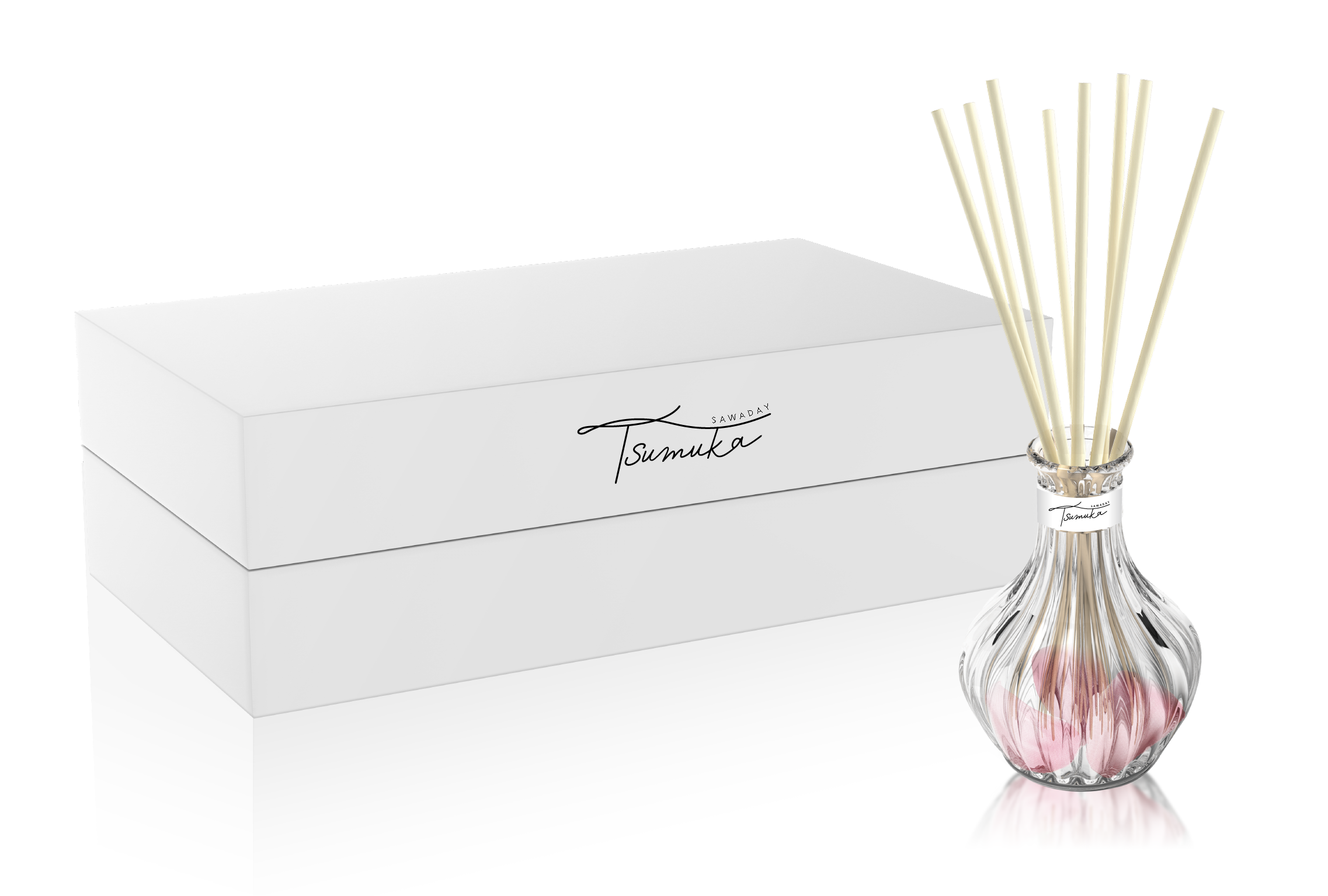 『Sawaday Tsumuka』は、フラワーシャワーに新郎新婦がセレクトした香りをつけ、その香りに特別な思い出を持っていただき、挙式1周年に同じ香りのリードディフューザーをご自宅にお届けすることで、「香り」によって日常生活の中で幸せなシーンを思い出していただく国内初の結婚式演出サービス※1です。