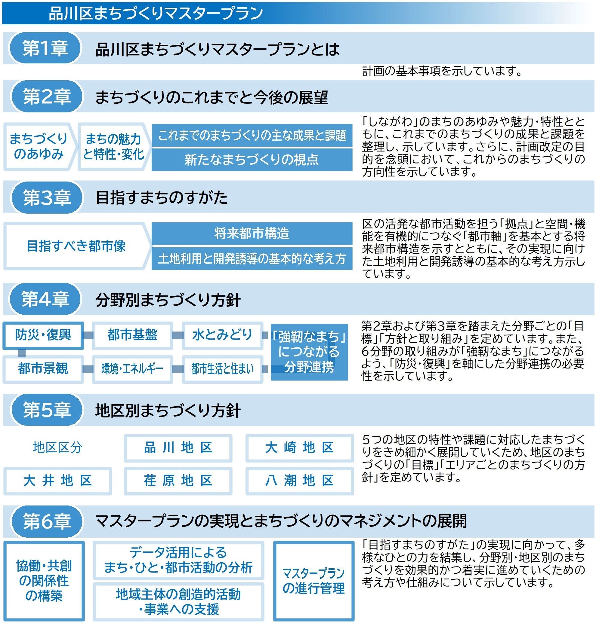 なお、「品川区まちづくりマスタープラン」は、都市計画法第18条の2第1項の「都市計画に関する基本的な方針」および品川区住宅基本条例第6条第1項の「住宅政策に関する基本計画」に該当するものです。