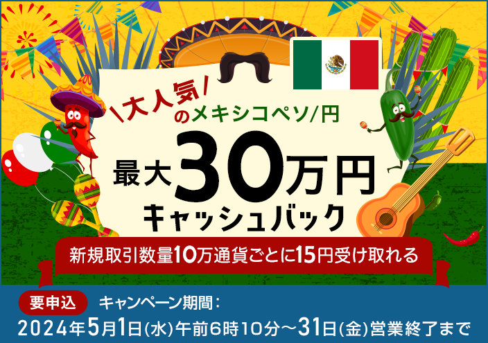 キャンペーンに申し込まれたお客さまに、期間中におけるメキシコペソ/円の新規取引数量に応じて、最大300,000円をキャッシュバックします。