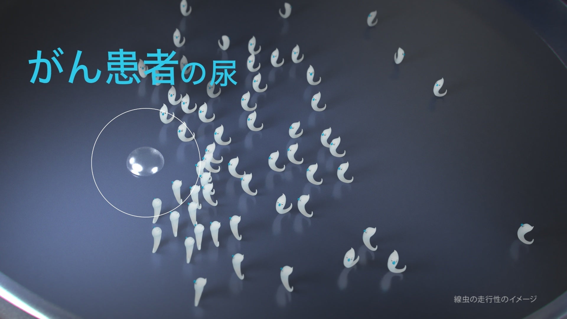 CMでは、線虫が匂いのもとへと進む「走性行動」をアニメーションで表現し、自然界の仕組みを医療に生かす「生命科学の力」を描いています。わずか1mmの線虫が、人の尿に含まれるがん特有の匂いを嗅ぎ分ける。その姿を通じて、当社が掲げる理念——生命の仕組みを科学として社会に生かす——を象徴的に伝えています。