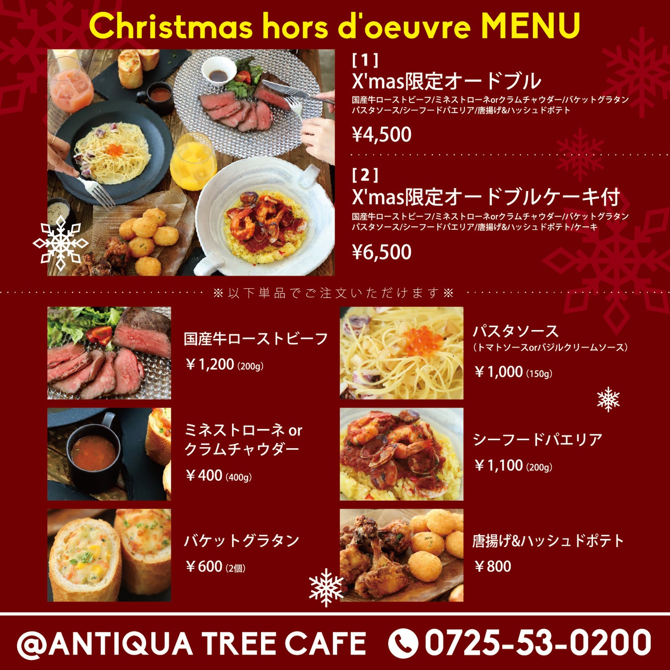 「ANTIQUA TREE CAFE」(大阪府和泉市)を運営する株式会社ツリーカフェは、このたびクリスマス限定オードブル&ケーキのご予約を開始しました。