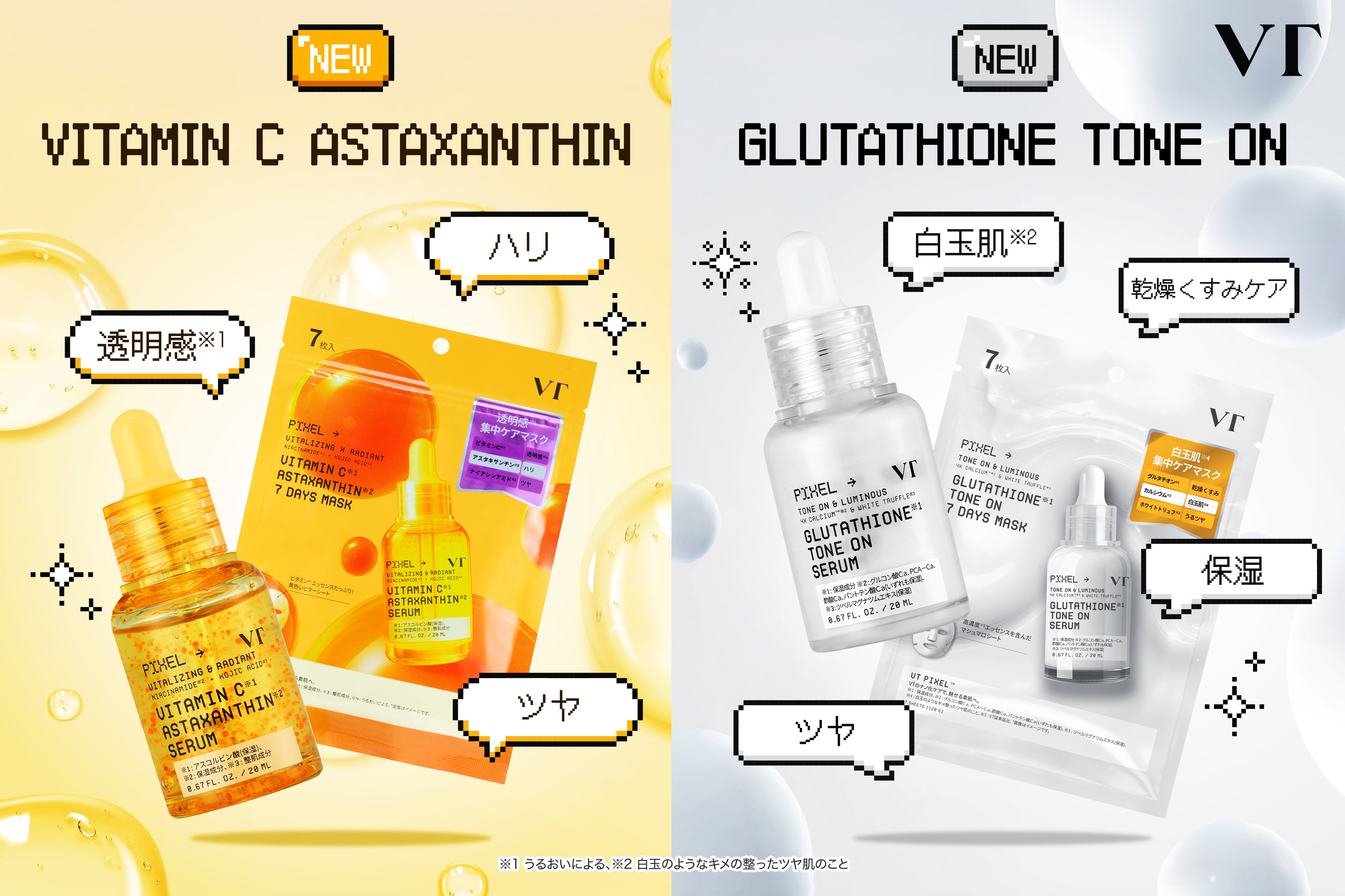 今回登場する「ビタミンC アスタキサンチン」ラインと「グルタチオン トーンオン」ラインは、それぞれ異なる悩みに寄り添いながら、毎日のケアに取り入れやすい使用感と、VTならではの成分設計にこだわった新作ラインです。