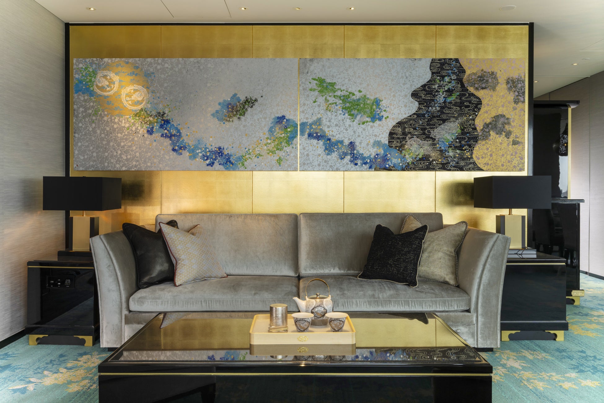裕人氏は、京都・西陣の金箔加工技術を用いて、名古屋城の障壁画など多くの国宝や重要文化財の複製を手掛けてきた箔工芸作家。ベッドルームのヘッドボードには月をイメージさせる大きな円に青と金の箔が浮かび、リビングの作品は、生命力あふれる赤と金の箔で彩られています。いずれも奈良時代から受け継がれた日本の手仕事であり、西陣で認められた確かな技術を、アートに昇華させた箔作品です。