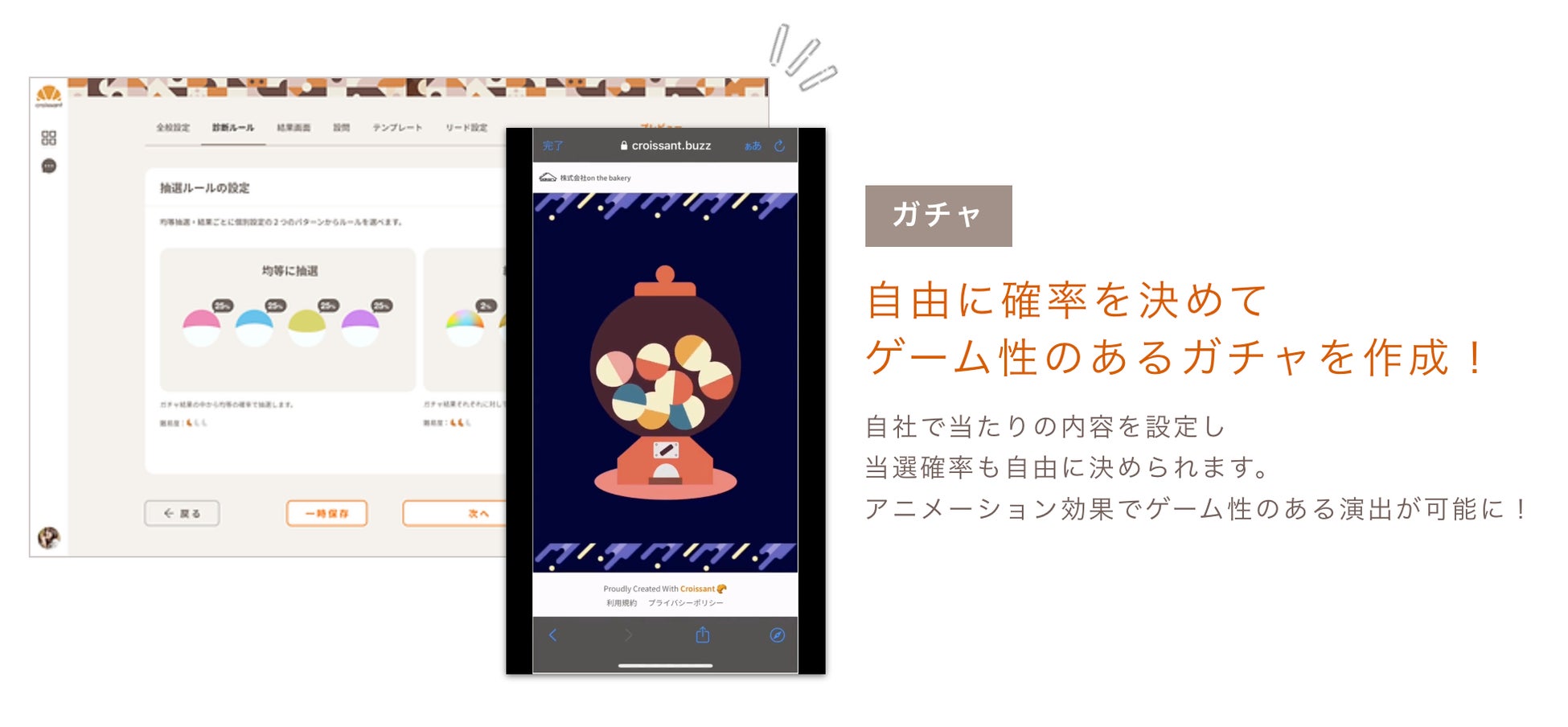 クロワッサンは、企業向けにオンラインガチャ・診断コンテンツを作成できるツールです。