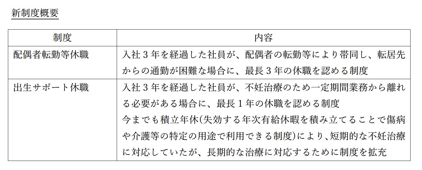 仕事と家庭の両立支援制度「配偶者転勤等休職」並びに「出生サポート休職」を新設