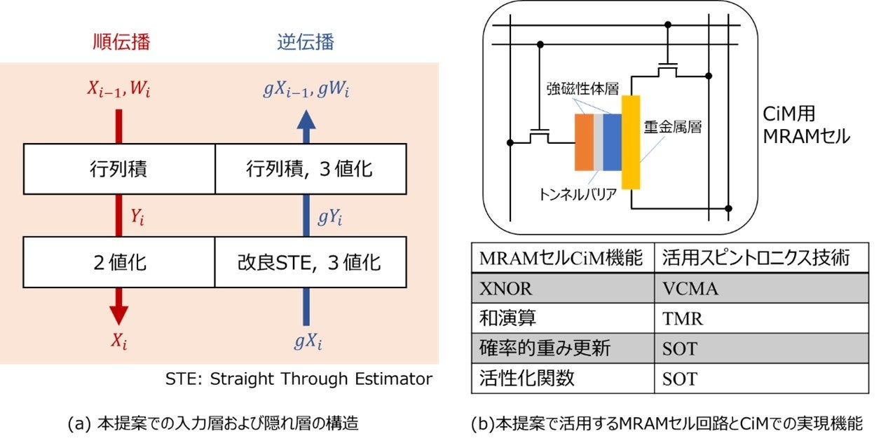 東京理科大学工学部電気工学科の河原 尊之教授と同大学大学院工学研究科電気工学専攻の藤原 優哉氏(2023年度修士課程修了)は、学習時に利用する勾配に3値を採用して重みの更新は2値のまま行うことができるBNNである三値勾配二値化ニューラルネットワーク(TGBNN: Ternary gradients binarized neural network)を提案しました。更に、スピントロニクス(*1)技術を活用し、単一MRAM(磁気抵抗メモリ、*2)セルによるXNOR ゲート及び確率的更新手法を考案しました。これをメモリ素子と演算素子を1つのチップ上で統合したComputing in Memory (CiM) として利用したMRAMアレイを用いることで、TGBNN実現の先鞭をつけました。