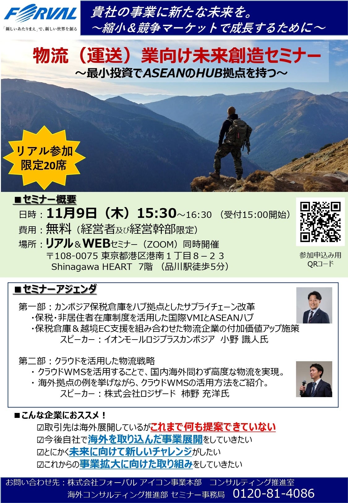 今、物流(運送)業界全体においては、ガバナンス対策・市場縮小・人手不足などが課題であり、中小企業にとっては非常に厳しい経営環境となっています。そして、このような環境下にさらされている中小企業が成長していくためには、「海外」というキーワードは重要度を増すばかりです。そんな中、イオンモールロジプラスカンボジア社が、2023年7月にカンボジアのシアヌーク港に保税・非居住者物流センターを竣工いたしました。イオンモールロジプラスカンボジア社とフォーバルカンボジアは委託契約を締結しており、フォーバルグループとしても物流(運送)企業にとっての新たな海外展開の手法、顧客への付加価値提案の手段、事業拡大戦略の機会を提供したいと考え今回のセミナーを開催する運びとなりました。