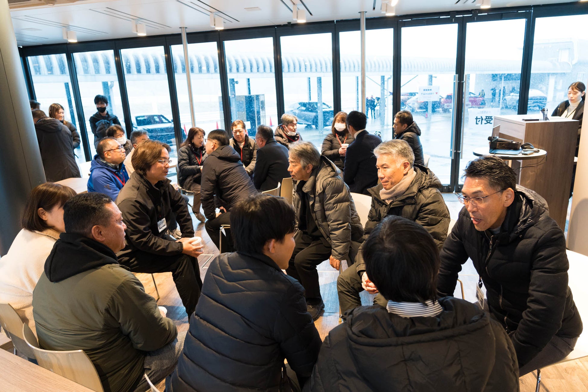 試乗終了後、クラウン開発陣と参加者が向き合いフリーディスカッションを実施。参加者からは、16代目クラウン発表時の刷新されたブランドイメージへの当時の驚きの声やクラウンの乗り味への率直な感想、疑問を開発陣に積極的に投げかけ、開発陣も参加者からの率直な感想や意見に耳を傾け今後の開発への参考にしていました。参加者からは「開発陣が気さくで販売店では聞けない話や開発のこだわりを聞くことができた」などの声があがり、終始クラウンについてそれぞれの想いを語り合い、イベント終了を惜しむ様子も見られました。