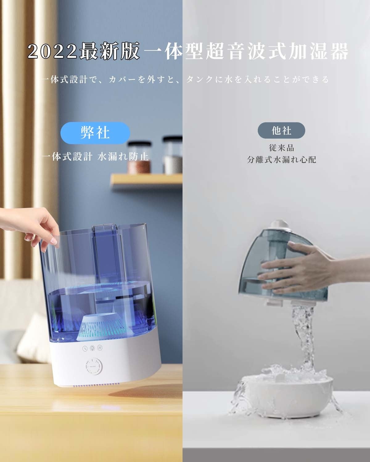 【一体型の設計&Ag+抗菌フィルター付き】従来品はタンクと下部セットでの加湿器との比較、 本製品は一体型設計で、水漏れはありません。ご安心使ってください。また、Ag+抗菌フィルター付きで、水をきれいに保ち、有害な雑菌の繁殖を防ぐことができます。是非オススメましょう。