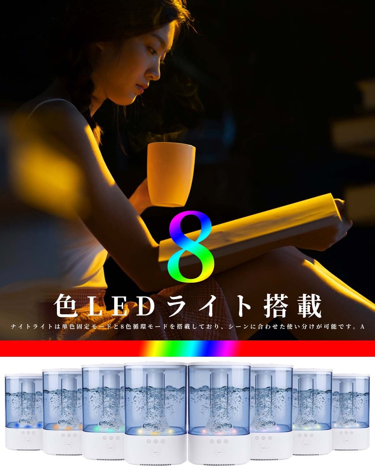 【アロマ対応&8色ナイトライト】耐食性と安全性の高いABS+AB材料で作られた水タンクに、お好きなエッセンシャルオイルを入れると、アロマディフューザーとして、空気清浄、加湿しつつも、香りによる心地よさを得られます。おしゃれのライトは8色循環モードと単色固定モードを搭載しています。幻想的な空間でリラックスしてください。【1年間の安心対応】日本のPSE規格に適合しており安心してご使用いただけます。 ご購入後30日間は商品に不具合がございます場合は新品交換させていただきます。不明な点がございましたら、アマゾンの購入履歴より弊社までご連絡ください。