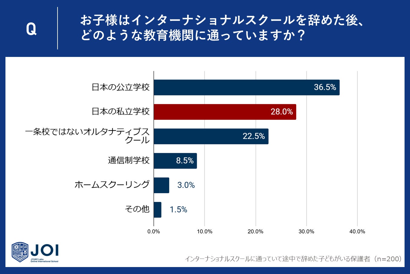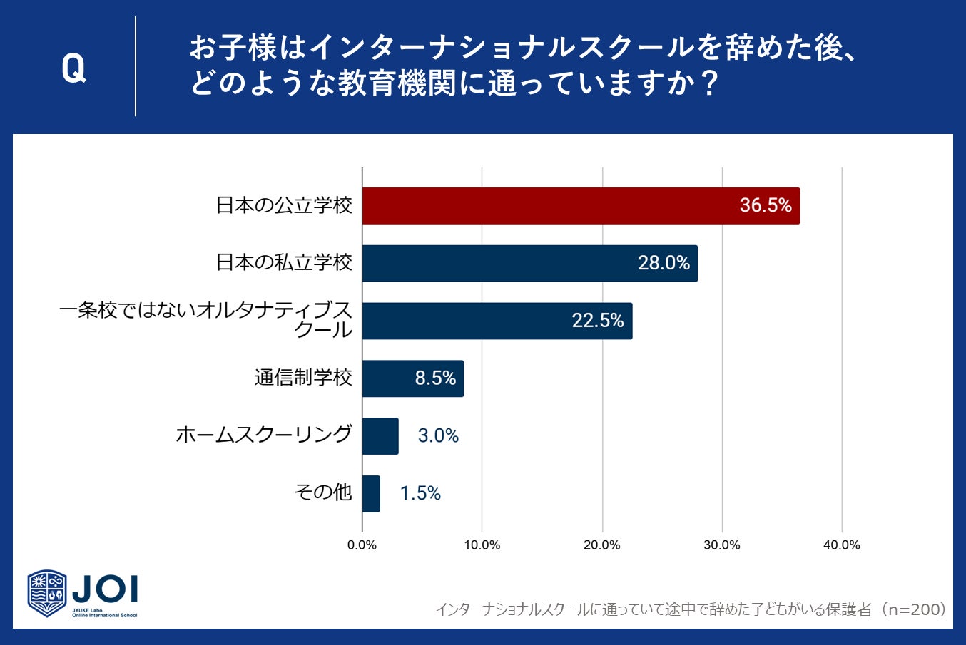 じゅけラボOnlineインターナショナルスクールJOI(所在地:大阪市北区、代表取締役:後藤智則)は、インターナショナルスクールを途中退学した経験がある子どもの保護者200人に、インターナショナルスクール退学後の通学先と再入学の可能性についてアンケート調査を実施しました。