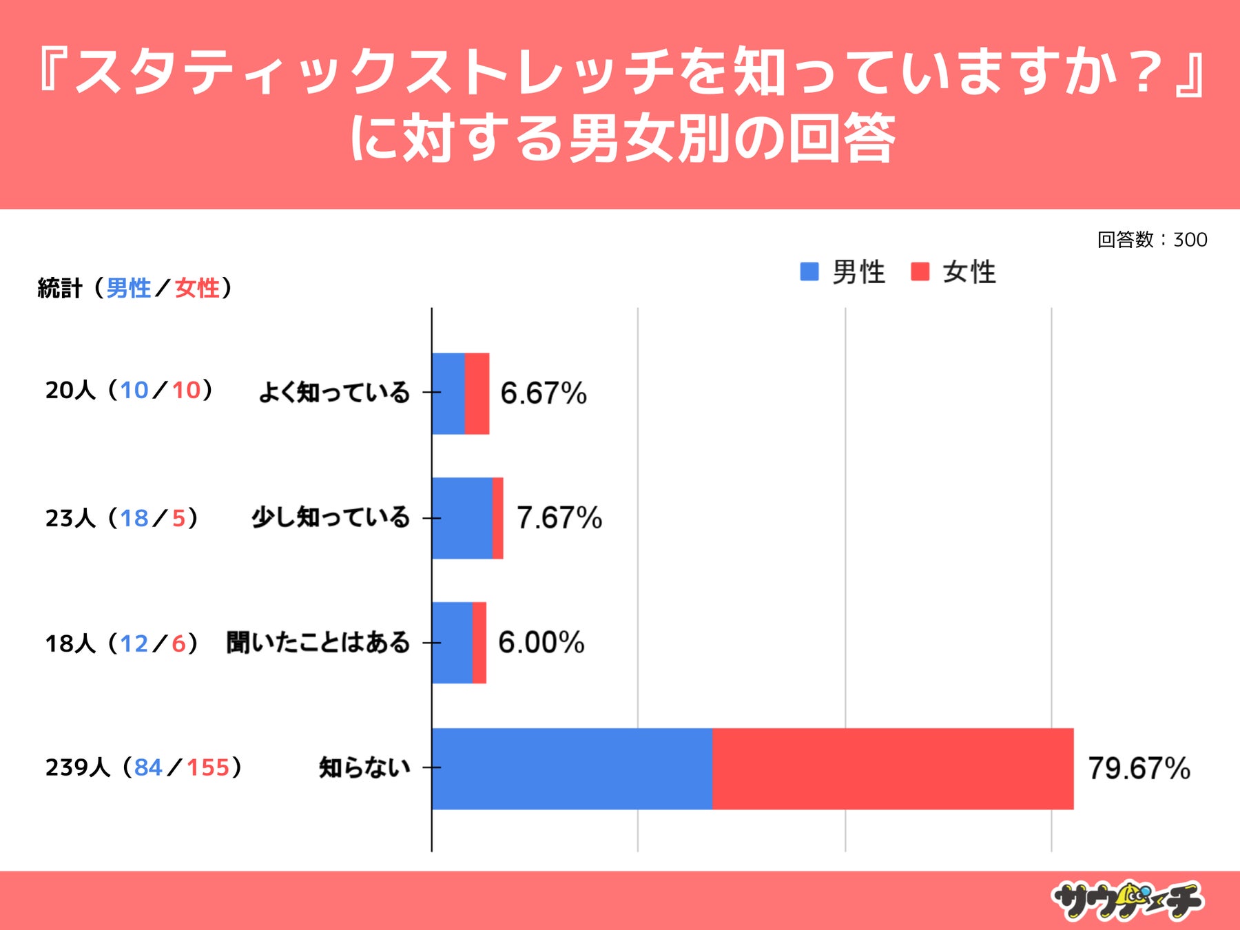 10〜30代男女を対象とした『スタティックストレッチを知っていますか?』というアンケートで、最も多かった回答は「知らない」で約80%でした。
