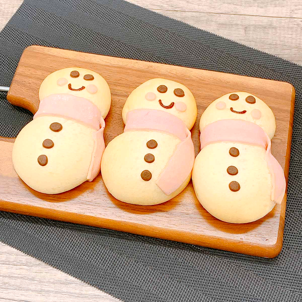 あたまにカスタードクリーム、おなかにチョコクリームを包んだ雪だるまのパンです。