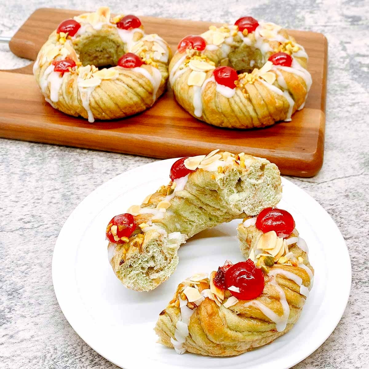 常緑樹をイメージしたピスタチオ風味のパンにチェリー、アーモンド、ピスタチオを飾った