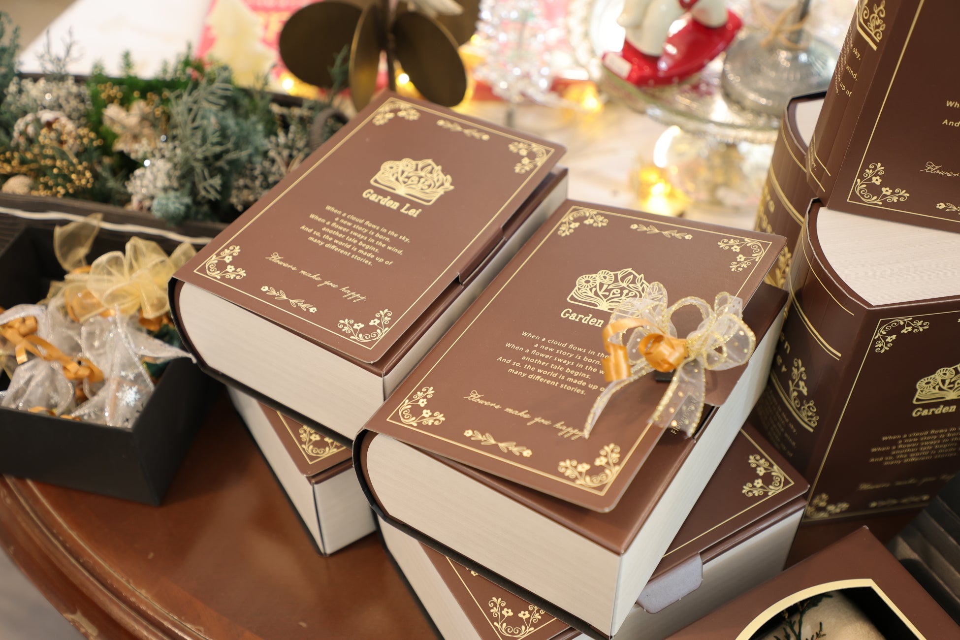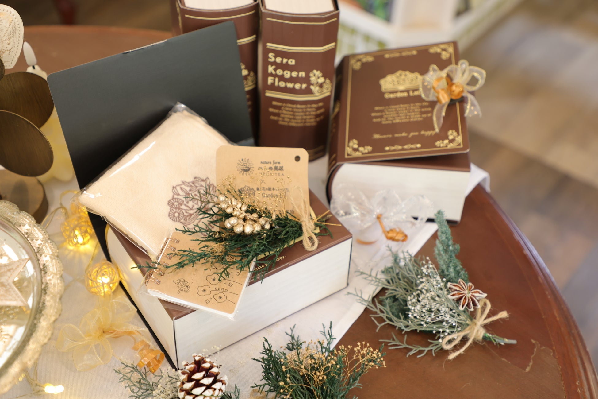ショップでは絵本の販売のほか、クリスマス雑貨を扱っています。また、オリジナル本型ボックスに刺繍ロゴハンカチ、ミニメモ、ハーブティー、ミニブーケをセットにしたギフトボックスを販売しています。絵本のほか、お買い物をお楽しみいただけます。