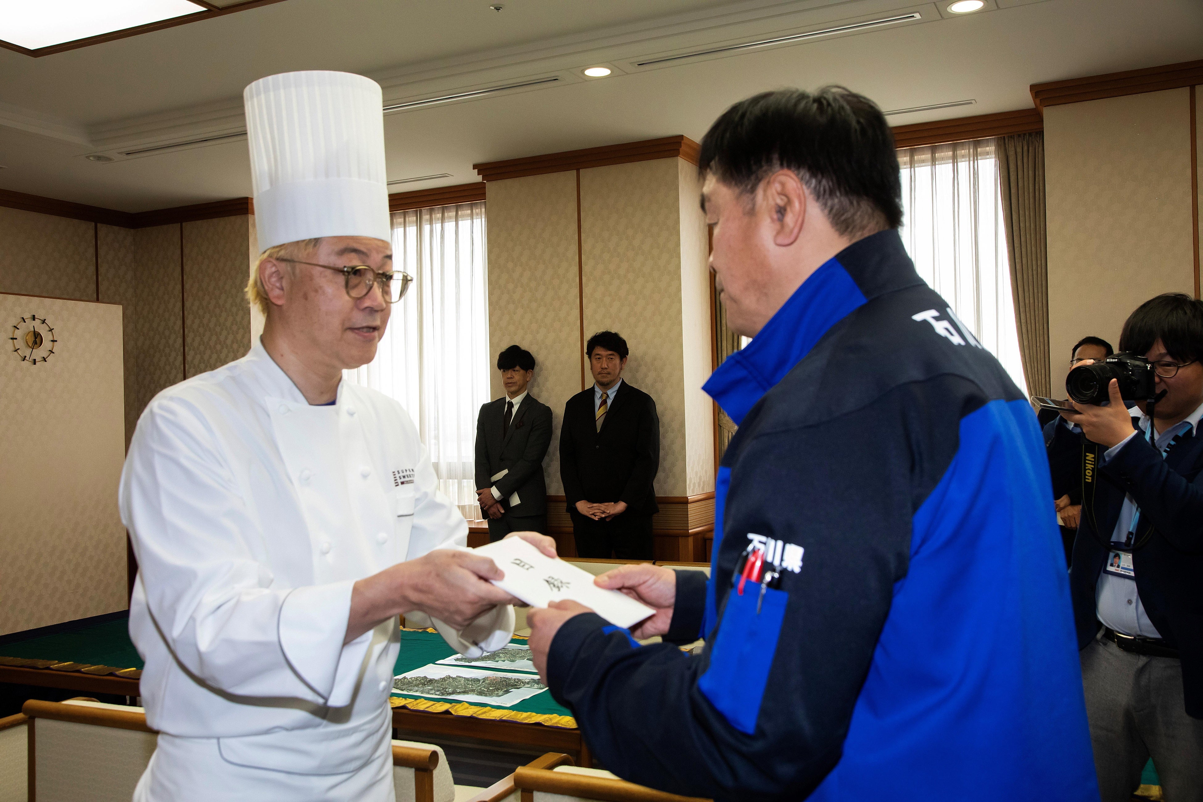 能登半島地震発災から10日後には被災地に入り、非常食や手作りのお菓子を避難所に届けたり、炊き出しを手伝うなど災害ボランティア活動を行った報告及びグループ店舗をはじめ、辻口博啓の呼びかけに賛同した全国のパティスリー、レストラン、 製菓材料メーカーなどから寄せられた義援金をお渡し、能登地震における被災者救援・復興・復旧活動・子どもたちの未来への一助として役立てていただくようお願いを致しました。