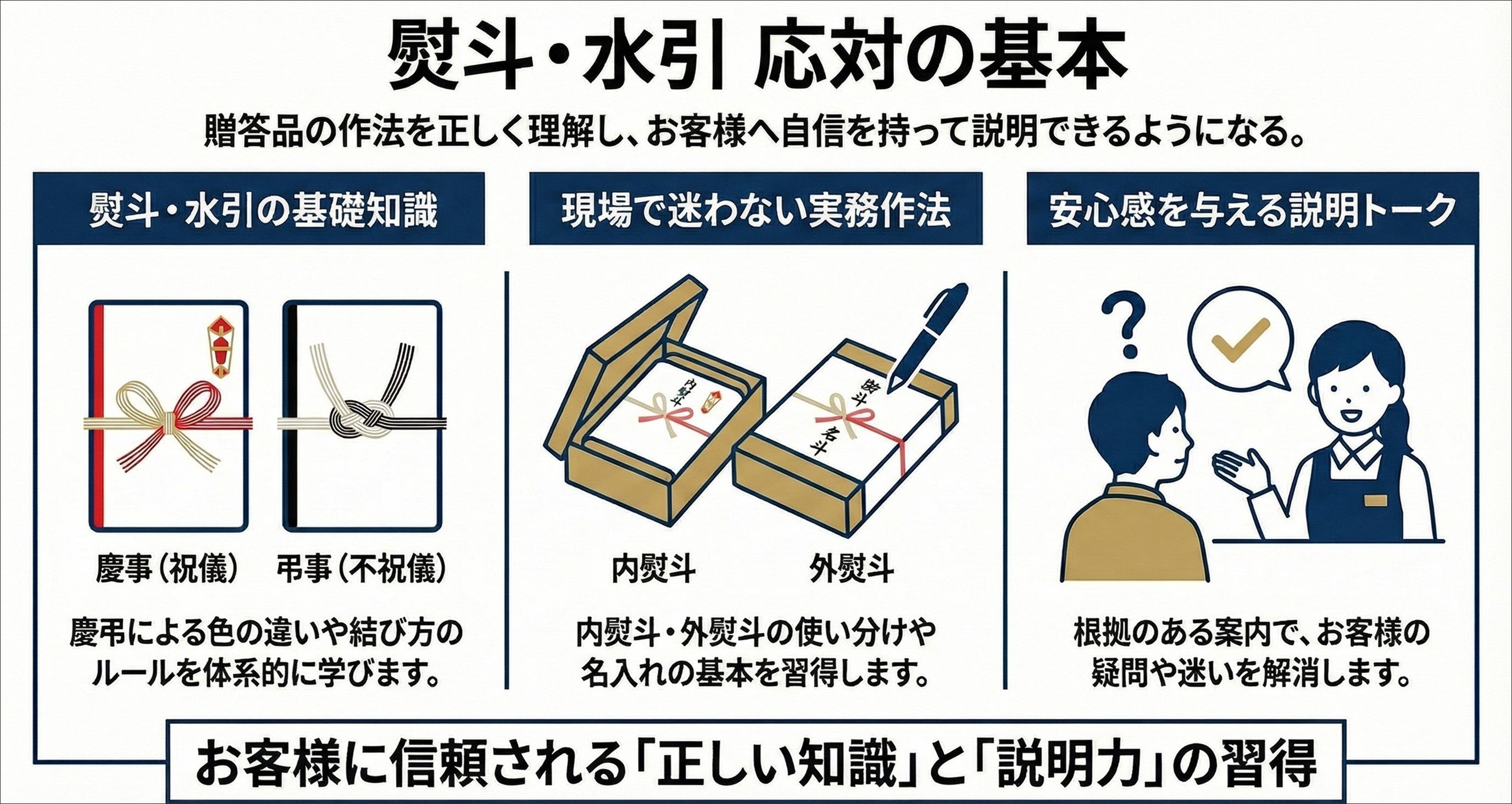 慶事や弔事における正しい使い分けを理解し、名入れや表書きなどの具体的な作法を実務で活用できる状態を目指します。また、根拠のある案内によってお客様に安心感を与える応対を実装します。