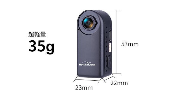 本体寸法は23×53×22mmと非常にコンパクトで、重さは卵1個ほどの35gです。存在を忘れてしまうほど軽く、胸に下げたり帽子にクリップで留めても全く負担になりません。どこにでも持ち運びできる手軽さが魅力です。