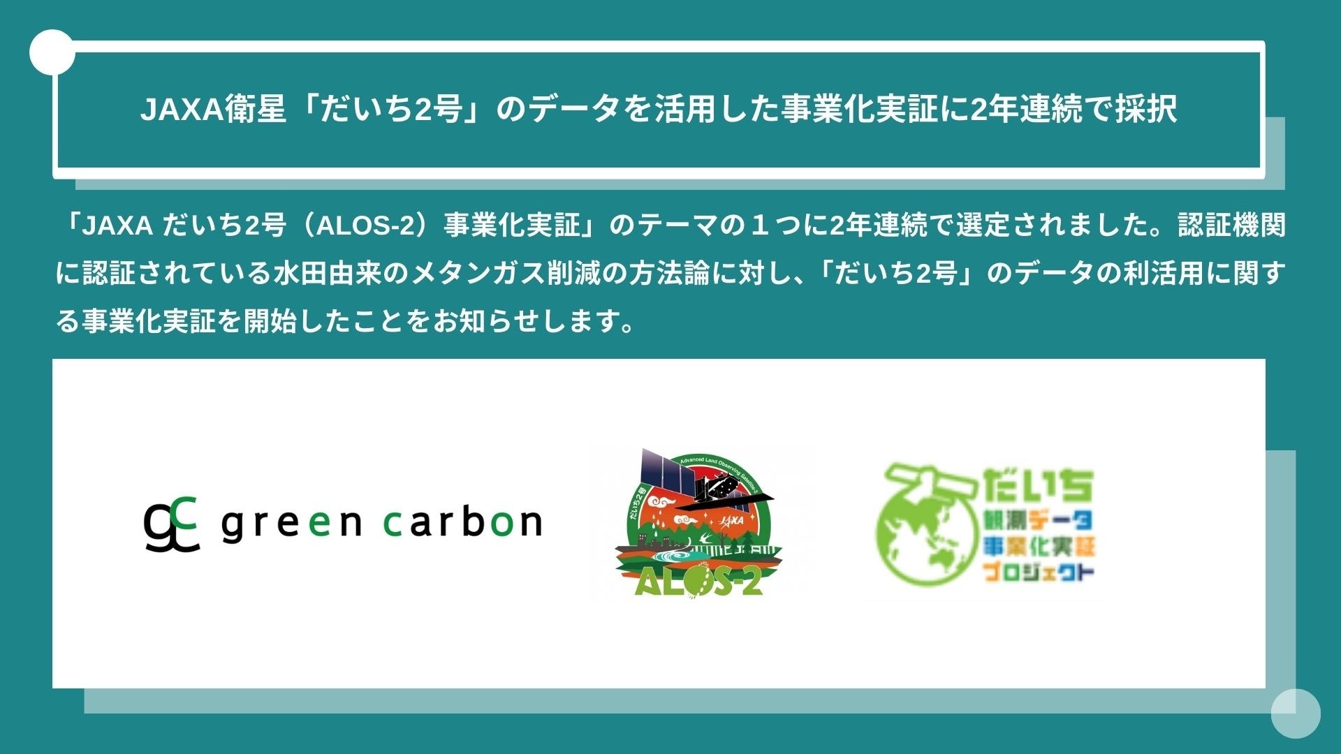 Green Carbon株式会社(代表取締役:大北潤、以下Green Carbon(読み:グリーンカーボン))は、国立研究開発法人宇宙航空研究開発機構(以下JAXA)が行う、陸域観測技術衛星2号「だいち2号」(ALOS-2)事業化実証(以下、本実証)のテーマの1つに2年連続で選定されました。認証機関に認証されている水田由来のメタンガス削減の方法論に対し、「だいち2号」のデータ利活用に関する事業化実証を開始したことをお知らせします。