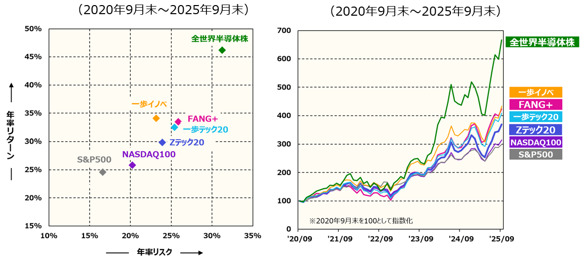 ※FANG+(NYSE FANG+指数)、一歩イノベ(Mirae Asset Global Innovative Bluechip Top 10+ Index)、一歩テック20(FactSet US Tech Top 20指数)、NASDAQ100(NASDAQ100指数)、S&P500(S&P500指数)、Zテック20(シミュレーションと実績)、全世界半導体株(NYSE FactSet 全世界半導体株インデックス)を使用。