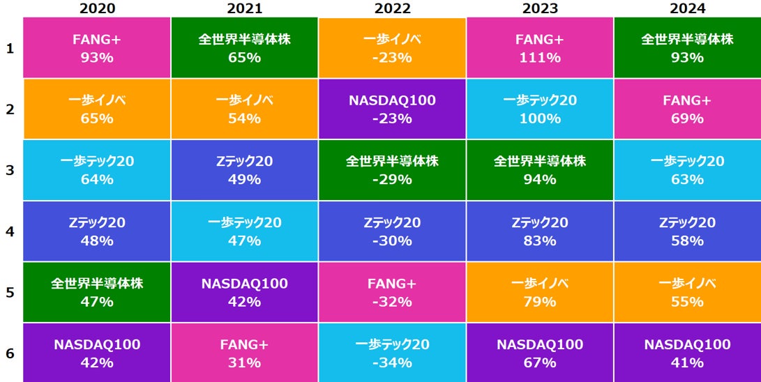 ※FANG+(NYSE FANG+指数)、一歩イノベ(Mirae Asset Global Innovative Bluechip Top 10+ Index)、一歩テック20(FactSet US Tech Top 20指数)、NASDAQ100(NASDAQ100指数)、Zテック20(シミュレーションと実績)、全世界半導体株(NYSE FactSet 全世界半導体株インデックス)を使用。
