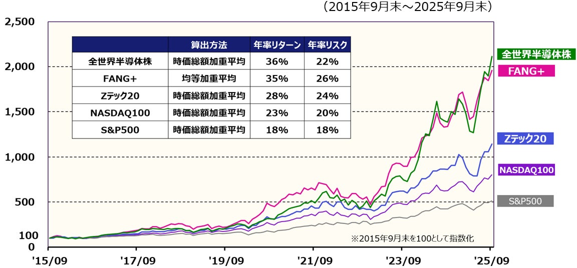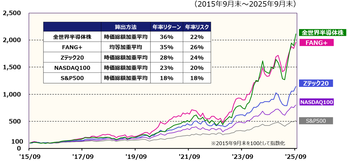※FANG+(NYSE FANG+指数)、NASDAQ100(NASDAQ100指数)、S&P500(S&P500指数)、Zテック20(シミュレーションと実績)、全世界半導体株(NYSE FactSet 全世界半導体株インデックス)を使用。