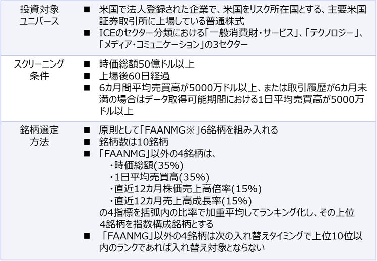 FANG+指数は、世界を席巻する米国企業10銘柄に均等(各銘柄10%ずつ)に投資する株価指数です。毎年3月、6月、9月、12月の第3金曜日に構成銘柄の見直しと各銘柄の組入比率を10%に調整するリバランスが実施されます。リバランス時における過去の構成銘柄変更については、弊社ホームページの「定期リバランス・ランキング更新のお知らせ」でご確認いただけます。