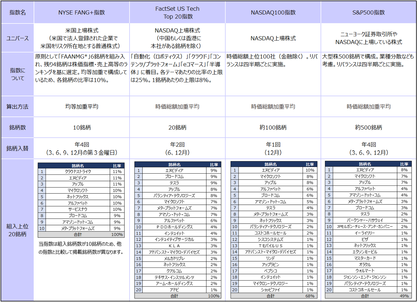 当資料では、NYSE FANG+指数をFANG+、 iFreePlus 世界トレンド・テクノロジー株(Zテック20)をZテック20 、NYSE FactSet 全世界半導体株インデックスを全世界半導体株、FactSet US Tech Top 20指数を一歩テック20、Mirae Asset Global Innovative Bluechip Top 10+ Indexを一歩イノベと呼ぶことがあります。
