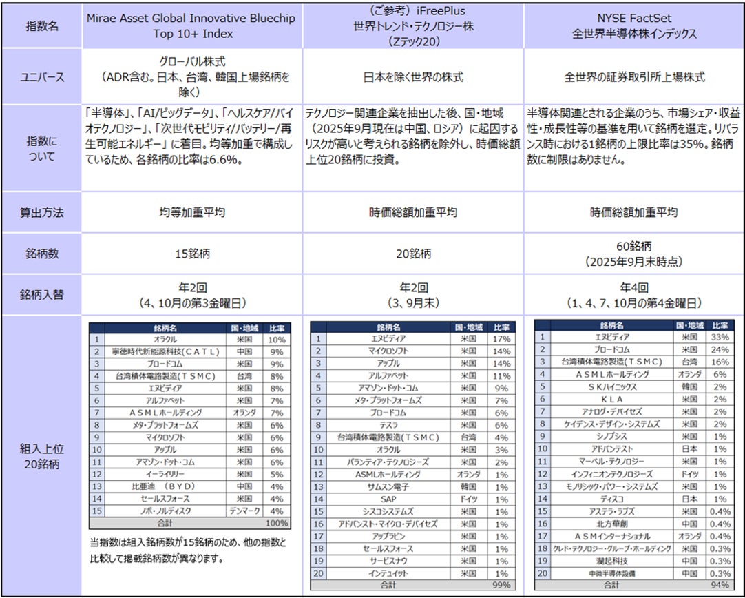 ※組入上位20銘柄は2025年9月末時点。Zテック20は2025年10月2日時点。銘柄名は発行体別に集計しています。 NYSE FactSet全世界半導体株インデックスの組入上位20銘柄はiFreeNEXT 全世界半導体株インデックスの組入銘柄と純資産総額に対する比率です。