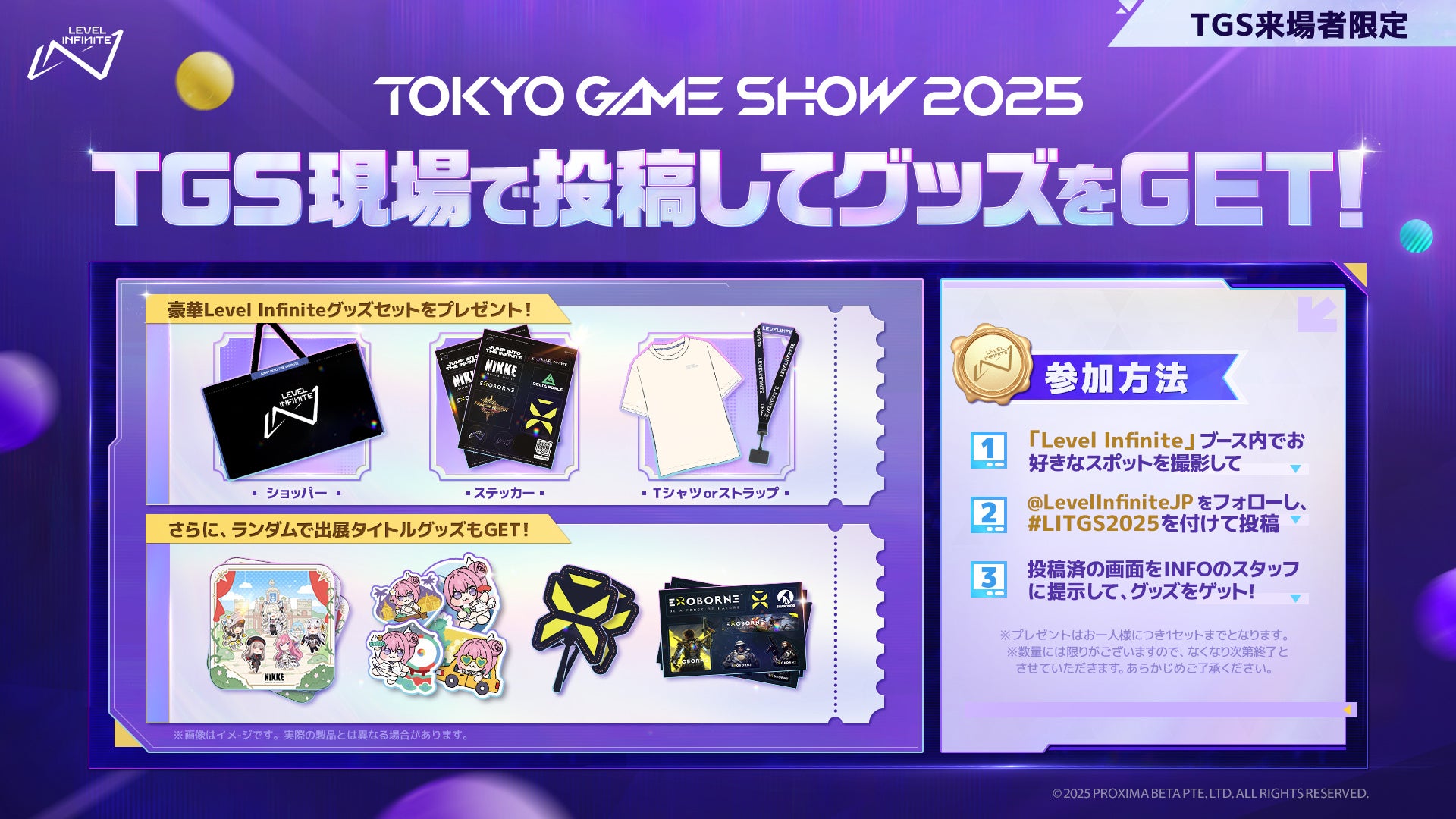 Level Infiniteブース内にて写真撮影を行い「#LITGS2025」のハッシュタグを付けた上で、ご自身のSNSアカウントに投稿。投稿済画面をインフォメーションスタッフにご提示いただくと、グッズをプレゼントいたします。