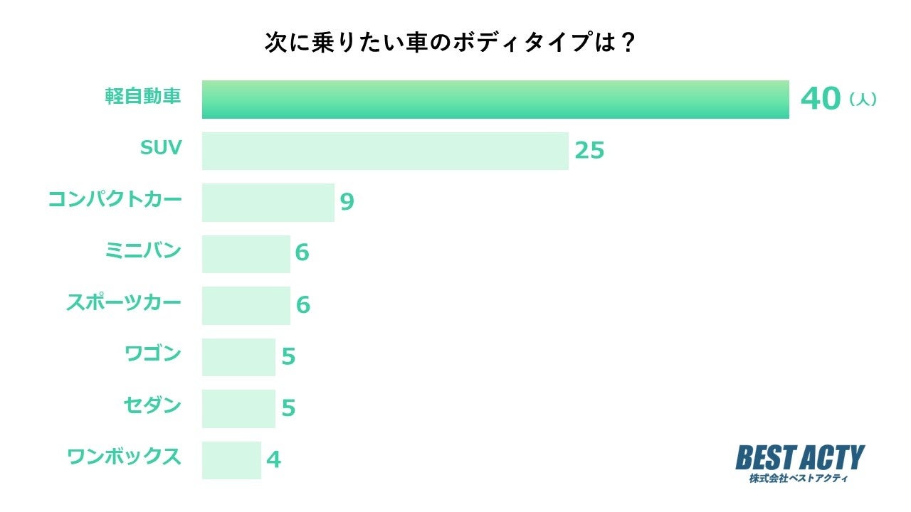 次に乗りたい車のボディタイプについて100人にアンケートを行ったところ、「軽自動車」と回答する人が最も多い結果となりました。