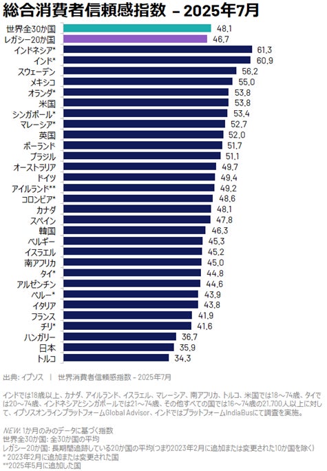 世界の消費者信頼感は今月も横ばい 「イプソス世界消費者信頼感指数 2025年7月」を公開
