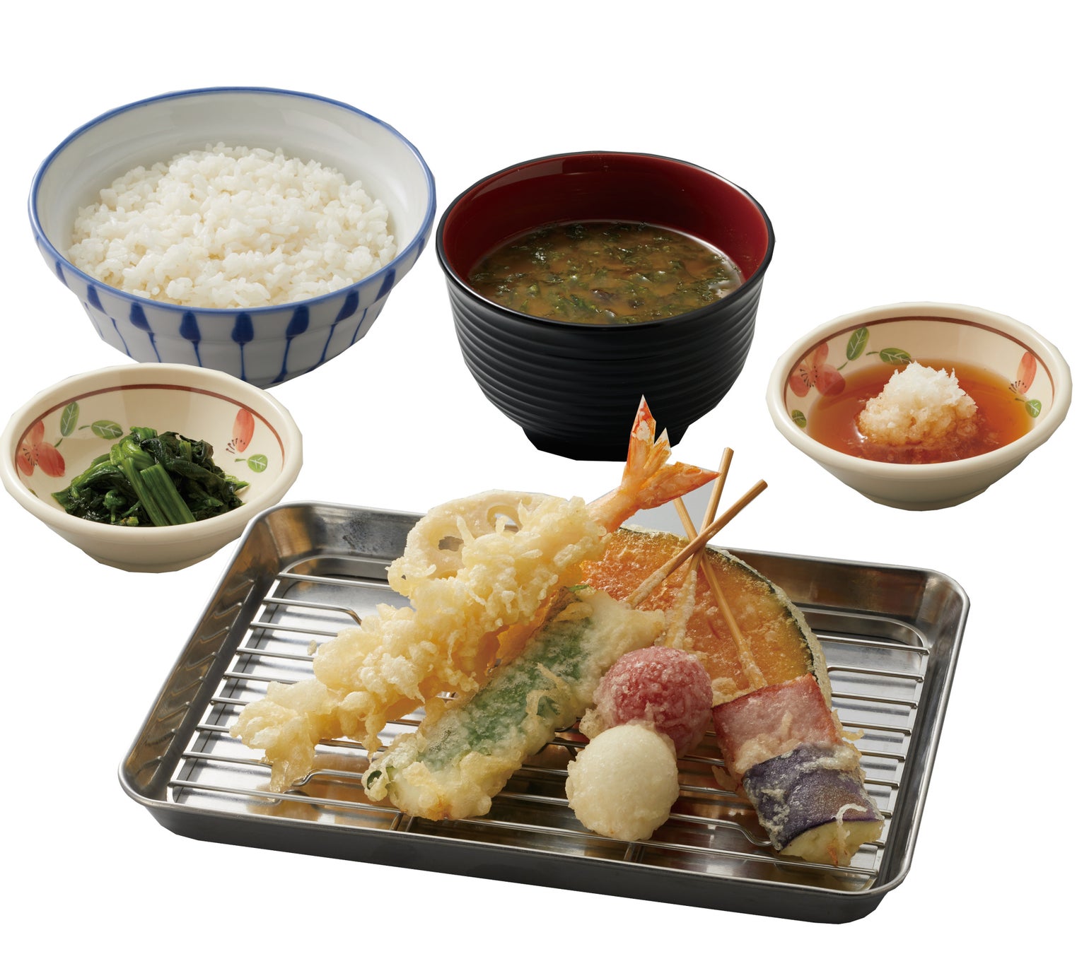 「色々な天ぷらを少しずつ、沢山楽しんでいただきたい」をコンセプトに、一口サイズの天ぷらを1串にした「トマたま串天」「ベーコンなす串天」、大葉の味わいと、いかの味わいが一つになった「いか大葉串天」の3種が入った天ぷら定食です。