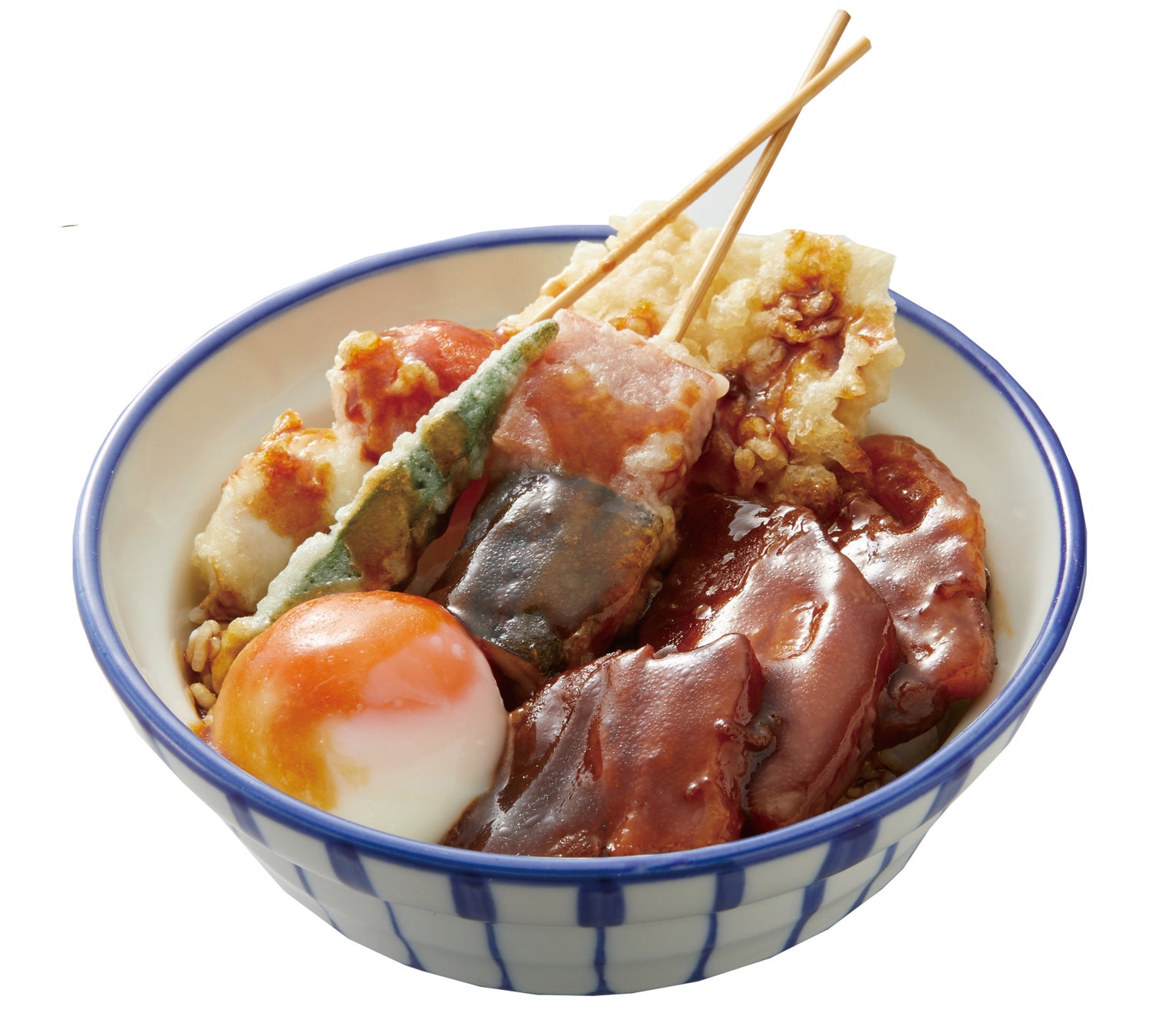 特製「豚角煮」と「串天」を甘辛いタレと絡めてご飯をかきこむ一品。