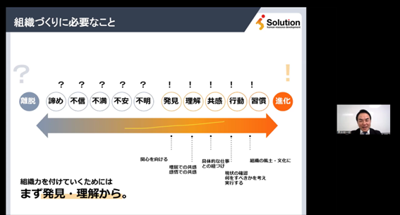 これらの要素を浸透させることで、組織は「誰かの指示を待つ指示待ち組織」から、「自らの一種を持って行動できる自律組織」へと変貌を遂げる。また、社員一人ひとりが「私」ではなく「私たち」や「会社」を主語にして語り始める瞬間が、組織が変わる兆しだと示されました。