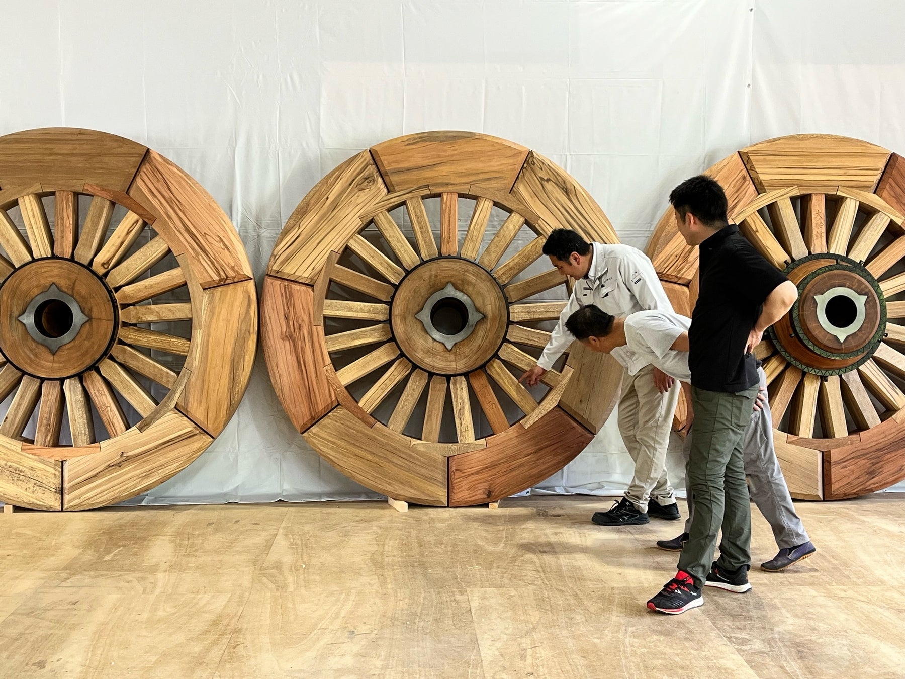 新調を請け負ったのは、岐阜県高山市の八野大工で、滋賀県大津祭の月宮殿山(げっきゅうでんざん)を手掛けたことがきっかけで依頼される形となりました。八野大工には、京都祇園祭とともに三大美祭に数えられる高山祭の屋台の修理を手がける、「高山・祭屋台保存技術協同組合」に加盟する職人が多く在籍しています。飛騨匠の技を引き継ぐ技術者の力を発揮し、非常に大きな車輪(直径約2.1メートル、重さ700キロ)4台を完成させました。