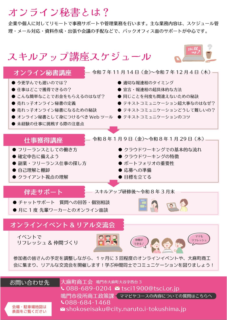 今年度は「オンライン秘書講座」および「仕事獲得講座」を開催し、ママさんの隙間時間を活用した在宅ワークによる収入確保を支援します。本講座では、参加者がオンラインでの講座を受講するとともに、定期的にオンラインイベントやリアル交流会を開催し、ママさん同士交流を深めながら学んで頂くこととしています。