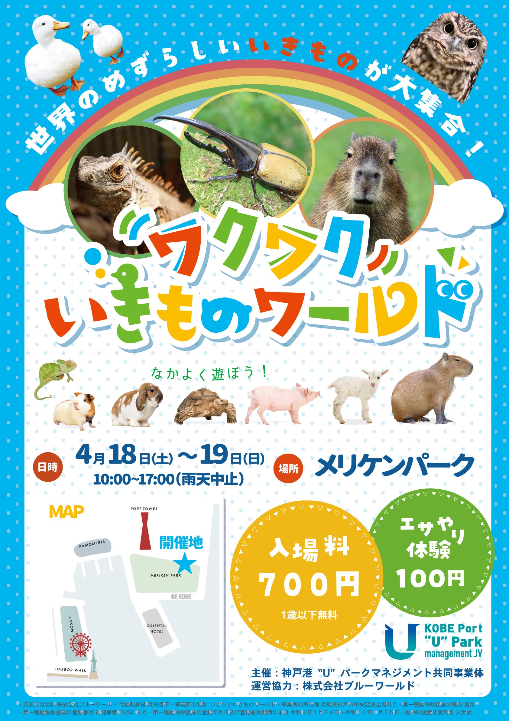 神戸港“U”パークマネジメント共同事業体(メリケンパーク指定管理者、代表企業:早駒運輸株式会社)は、2026年4月18日(土)・19日(日)の2日間限定で、体験型イベント『ワクワクいきものワールド』を開催いたします。