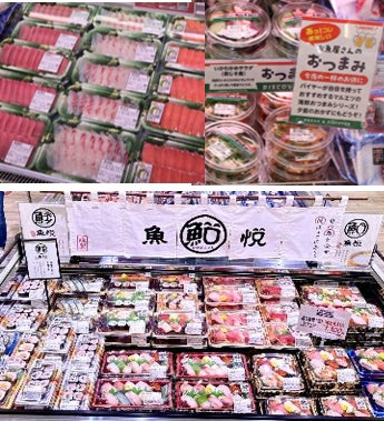 鮮魚では、定番の切身、生魚など旬の魚を中心に、季節感のある売場を展開します。また生食商品として、お刺身や冊、生珍味などを豊富に品揃えいたします。さらに鮮魚寿司「魚悦」や生鮮惣菜「おつなFISH」、「お魚屋さんのおつまみ」を導入いたします。