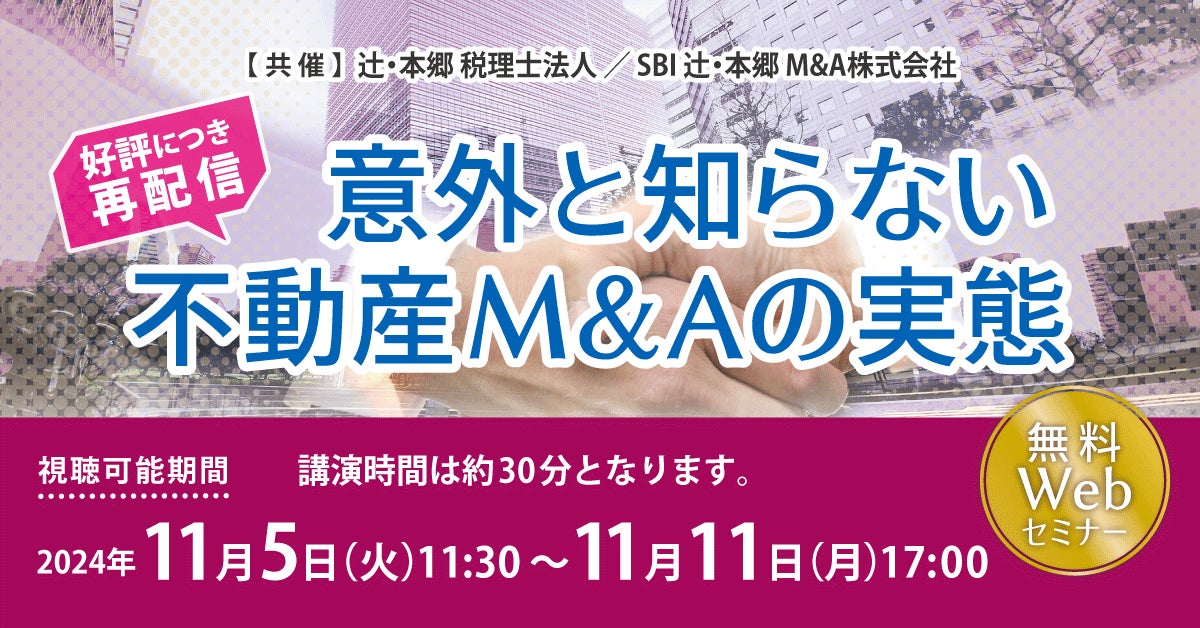 辻・本郷 税理士法人(本社:東京都新宿区、理事長:徳田孝司)は、SBI 辻・本郷M&A株式会社(本社:東京都千代田区、代表取締役:小林堅悟)と2社共催で「【好評につき再配信】意外と知らない不動産M&Aの実態」セミナーを開催いたします。リクエストにお応えし、2月に開催した不動産M&Aセミナーを再配信します。企業自体を買収するM&Aの手法を活用し、不動産取得を目的として不動産保有企業ごと取得することが不動産M&Aになります。本セミナーでは不動産M&Aと不動産売買との違いやメリット、デメリット、どういったときに不動産M&Aが有効に活用できるかについてわかりやすく解説します。